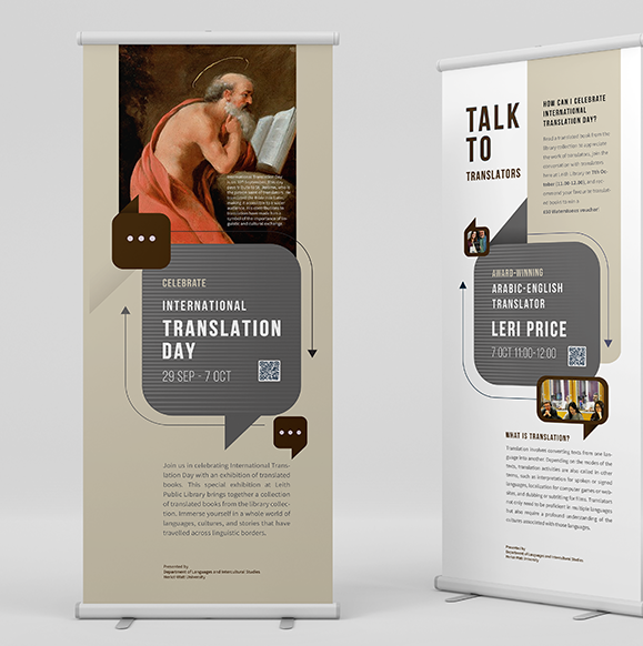 I created a series of graphic and print materials for the International Transition Day Book Exhibition and related events, commissioned by Heriot-Watt University. The designs aimed to connect the theme of translation with visual storytelling.