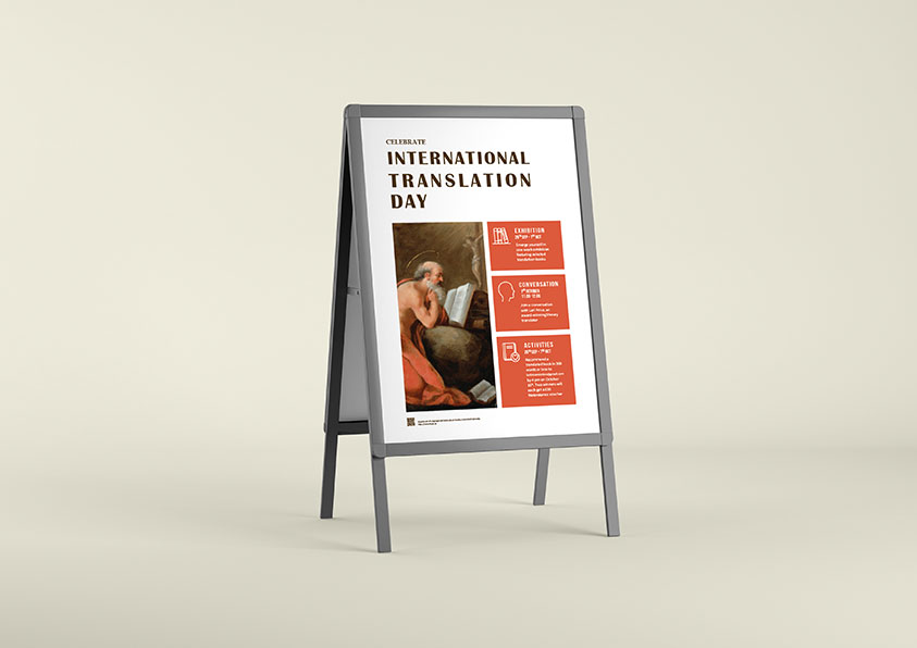 At the initial stage of the design process, I conducted research on the history and relevant symbols associated with International Translation Day and book exhibition events. We recognised St. Jerome as the iconic figure crucial to this day; consequently, we chose him as the design theme for the exhibition.