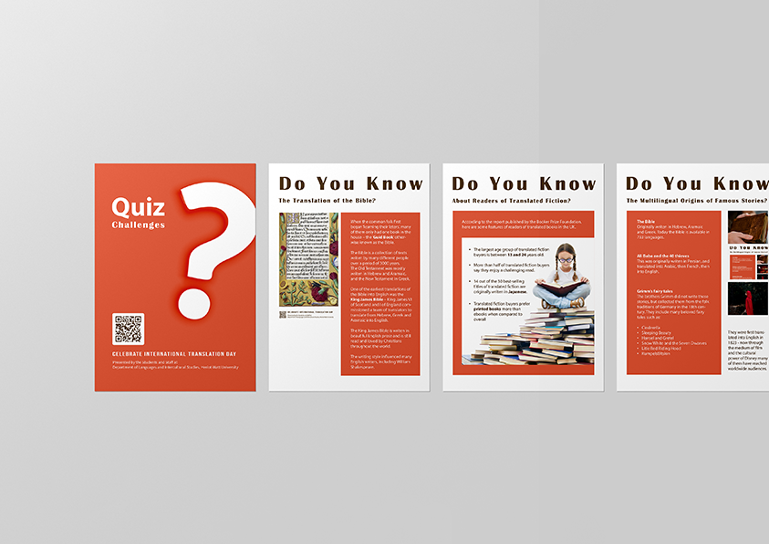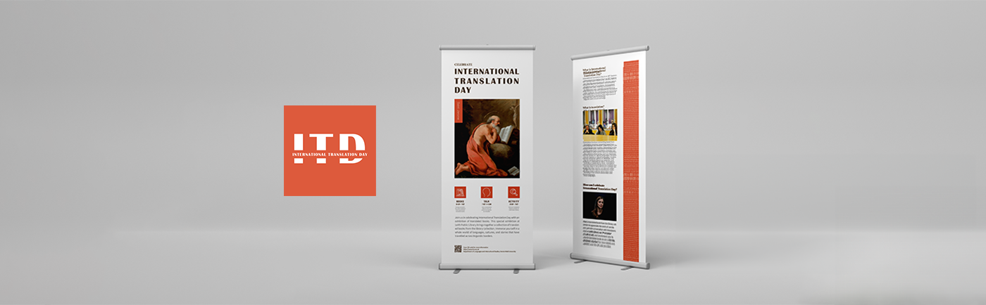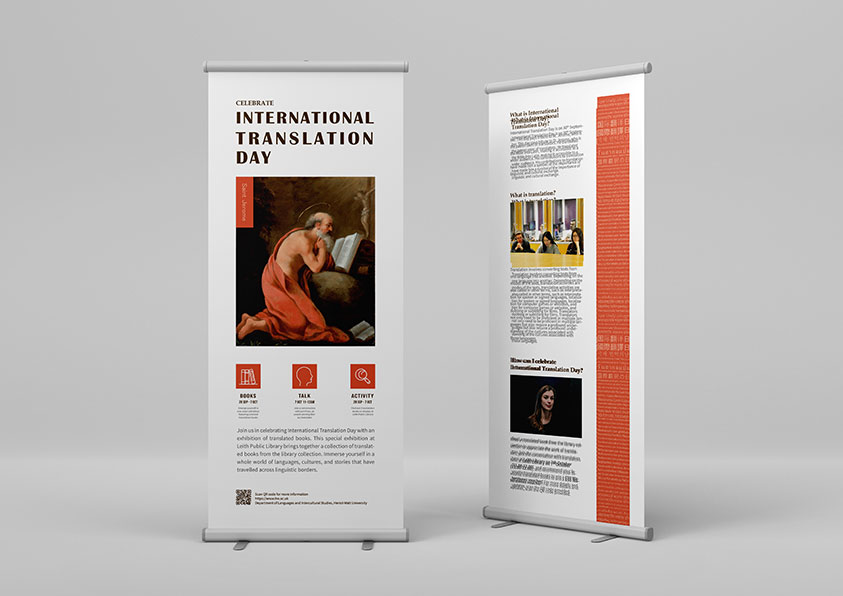 International Translation Day is a book exhibition organized by Leith Library and Heriot-Watt University to celebrate the work of translators and interpreters and to promote the importance of translation in bridging gaps between languages and cultures. I worked as a freelance designer to create a set of visuals for the exhibition display and related activities.